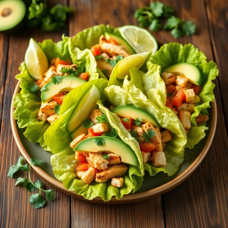 Ingredientes clave: Pechuga de pollo, hojas de lechuga (como iceberg o romana), especias (comino, pimentón, ajo en polvo), limón, salsa ligera de yogurt o aguacate.